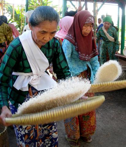 Dua orang nenek sedang "napi beas" atau membersihkan beras dari sekam menggunakan "nyiru" atau nampan dalam rangkaian upacara Ngalaksa di Desa Wisata Rancakalong; Kabupaten Sumedang pada 5 Juli 2007.
