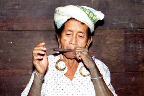Tipung Jawé, seorang seniman tua dari Kayan Mendalam tengah memainkan alat musik Tung, yaitu alat musik tiup khas Dayak.
