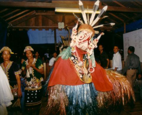 Pertunjukan masyarakat Dayak pada kunjungan tim MSPI ke daerah Kelian - yang disponsori Perusahaan Tambang Mas - Kelian Foundation - ca. 1998