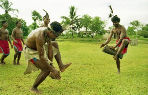 Pertunjukan tari wor dari Biak, Papua. Para penari menari sambil memukul tifa (perkusi). Tarian ini dilakukan untuk mencari berkah kepada Tuhan.