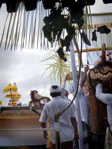 Para pria sedang menempatkan Topeng Barong di tempat yang baik untuk Pratima ini dalam kegiatan upacara Melasti di PantaiSaba; Kecaamtan Blahabtuh; Kabupaten Gianyar; Bali pada 2 Juli 2014.
