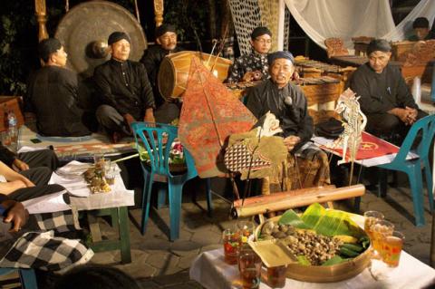 Dalang Hadi Suyono memainkan wayang kulit sebagai ruwatan (pembersihan roh jahat, menghindari bahaya), dalam upacara ngaben pemeluk Hindu di Jawa Tengah, Februari 2010.