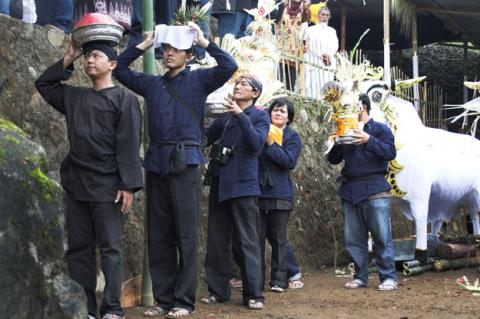 Para pemeluk Hindu mengusung sesaji dalam upacara ngaben di Jawa Tengah, Februari 2010. Sesaji adalah persembahan untuk para leluhur sebagai simbol rasa syukur kepada para dewa atas segala keselamatan dan kemakmuran.