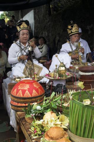 Pendeta perempuan Jawa, Sri Kanjeng Bhagawan Istri Agung Ratu Gayatri (kiri) dan pendeta laki-laki dari Bali (kanan) memimpin doa setelah pelaksanaan ngaben di Jawa Tengah, Februari 2010.