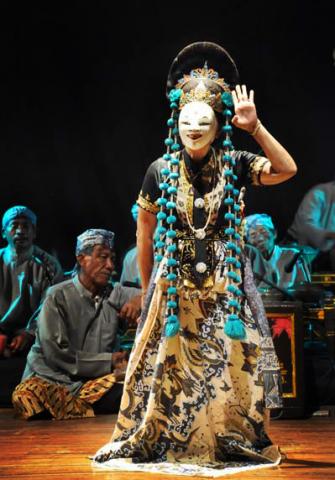 Keni Arja dalang topeng asal Slangit, Cirebon tengah menarikan tari topeng Panji dengan gerakan ngola pilis dalam pergelaran topeng Cirebon di STSI Bandung, 28 Juli 2011.