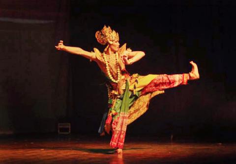 Sugeng Imam Hartanto, pemeran Hayam Wuruk, Raja Majapahit, dalam Drama-tari Citraresmi Labuh Pati yang dipergelarkan di Taman Budaya Jawa Barat, 31 Mei 2013. Dalam adegan ini, Hayam Wuruk yang disertai para prajuritnya tengah mencari calon isterinya. Ia menari sambil menaiki punggung dan pundak dari dua orang prajurit pengiringnya.