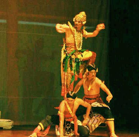 Sugeng Imam Hartanto, pemeran Hayam Wuruk, Raj Majapahit dalam Dramatari Citraresmi Labuh Pati yang dipergelarkan di Taman Budaya Jawa Barat, 31 Mei 2013. Dalam adegan ini, Hayam Wuruk yang disertai para prajuritnya tengah mencari calon isterinya. Ia menari sambil menaiki punggung dan pundak dari dua orang prajurit pengiringnya.
